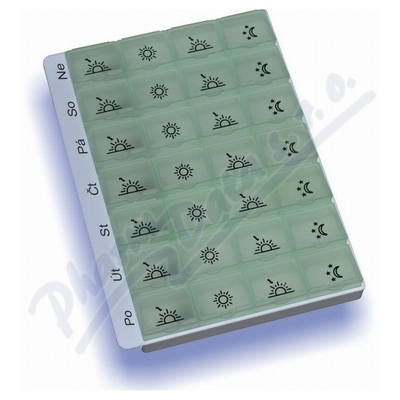 Slouží k přehlednému uspořádání a spolehlivému dávkování léků či potravinových doplňků doma i na cestách. Je označen jednoduchými symboly zobrazujícími denní dobu. Dostupný v několika barevných provedeních.Velikost dávkovače 175 x 125 x 20mm (d x š x v).