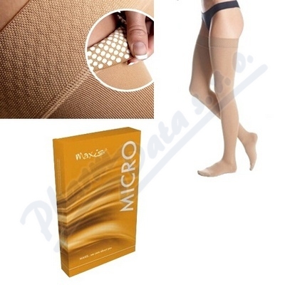 Elegantní matné kompresivní stehenní punčochy MAXIS® MICRO jsou vyrobeny z velmi jemného úpletu s vysokým podílem mikrovlákna. Obsahují antibakteriální a protiplísňovou úpravu. V provedení se špičkou nebo bez, s lemem nebo krajkou. V barvě brozn.