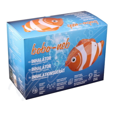 Inhalátor Bobo Neb je kompresorový inhalátor kompaktní velikosti, ve tvaru rybky. Balení obsahuje bohaté příslušenství: masku pro děti, masku pro dospělé, náustek, náhradní vzduchové filtry, vzduchovou hadici 150 cm a rozprašovač.