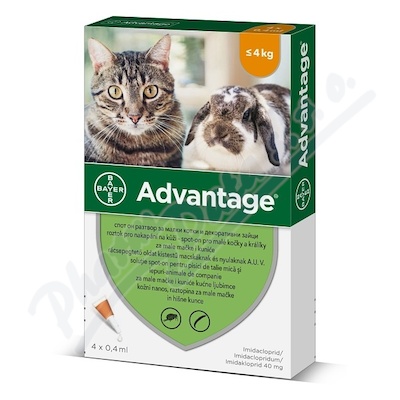 Advantage 40 mg roztok pro nakapání na kůži – spot-on pro malé kočky a králíky do 4 kg. Prevence a léčba napadení koček blechami. Léčba napadení králíků blechou kočičí při společném chovu králíků a psů/koček v domácnosti.