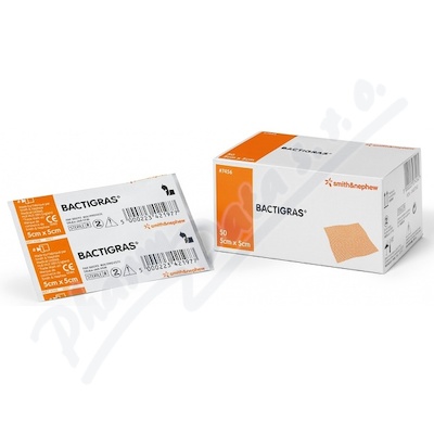 Bactigras je antiseptické nepřilnavé krytí z tylové tkaniny impregnované jemným bílým parafinem s účinnou širokospektrální antiseptickou složkou.