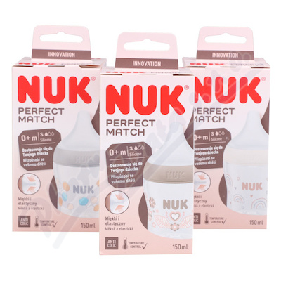 Kojenecká láhev NUK Perfect Match, s měkkou silikonovou savičkou "S" (pro mateřské mléko, čaj nebo vodu), 150 ml, od narození, neobsahuje BPA, antikolikový systém, s kontrolou teploty. Mix barev v kartonu.