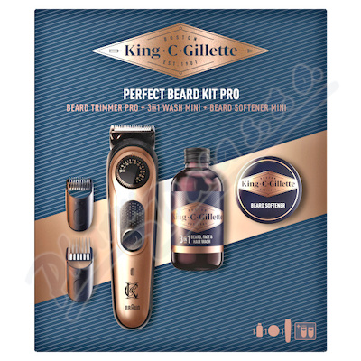 Sada King C. Gillette Beard Trimmer PRO obsahuje zastřihovač s přesným kolečkem se 40 nastaveními délky a 2 hřebeny, spolu se šamponem na vousy a balzámem mini máte plnou všestrannost navrhnout své strniště nebo vousy přesně tak, jak chcete.