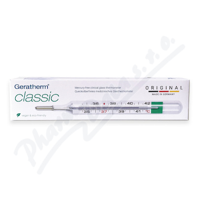 Teploměr skleněný bezrtuťový Geratherm měří teplotu těla přesně a spolehlivě. Má 10letou záruku přesnosti (0,10-0,15°C). Je 100% hygienický. Přiložené sklepávadlo umožní lepší sklepávání galia. Originál - vyráběný v Německu.