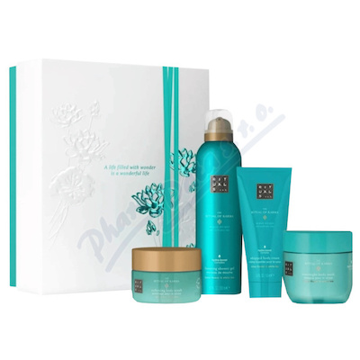Koupelové a tělové produkty v dárkové sadě. Společně vytvářejí lázeňskou atmosféru v pohodlí vašeho domova. Kosmetika řady Karma je obohacena o svěží a uklidňující vůni bílého čaje a lotosu.