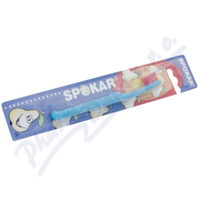 Dětšký zubní kartáček SPOKAR 3432, který je určen k péči o chrup těch nejmenších. Má měkká vlákna, rovný zástřih štětin a menší hlavu.